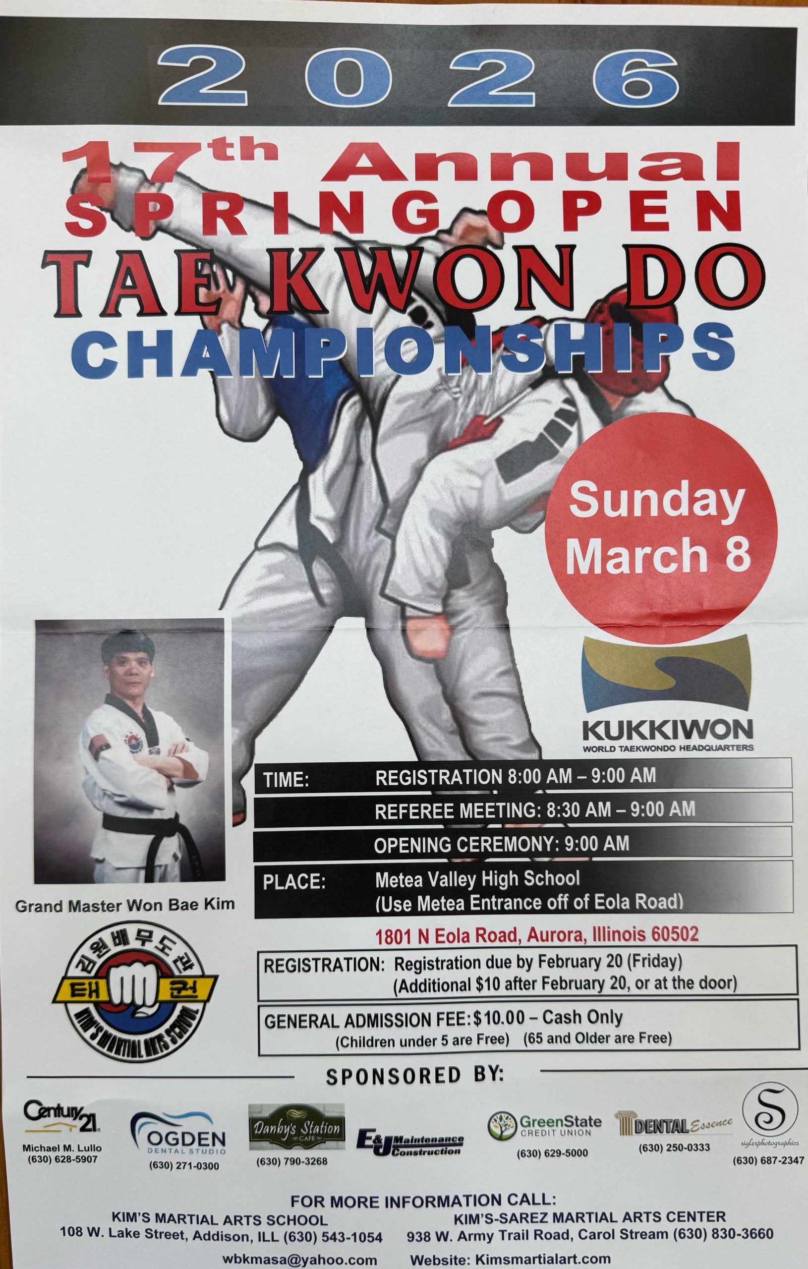 The next belt testing is scheduled for Saturday March 21, 2026 . You have all worked very hard. We look forward to your continuing effort and dedication to the Martial Art Taekwondo.